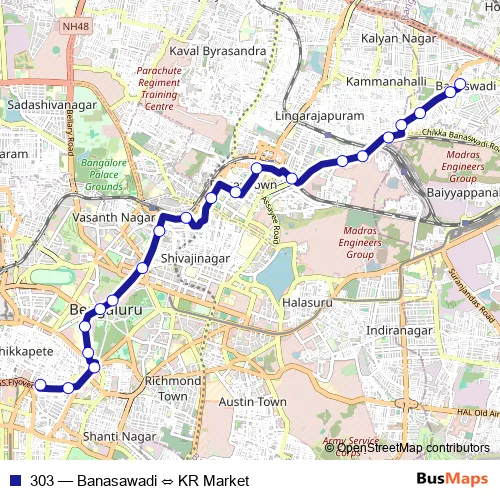 The first stop of the 303 bus route is Banasawadi and the last stop is KR Market. 303 (Banasawadi ⇔ KR Market) is operational during everyday.