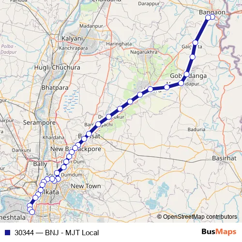 The first stop of the 30344 rail route is Bangaon Jn and the last stop is Majerhat. 30344 (BNJ - MJT Local) is operational during everyday.