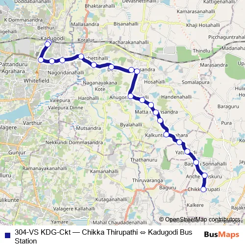Chikka Thirupathi. 304-VS KDG-Ckt (Chikka Thirupathi ⇔ Kadugodi Bus Station) is operational during everyday.