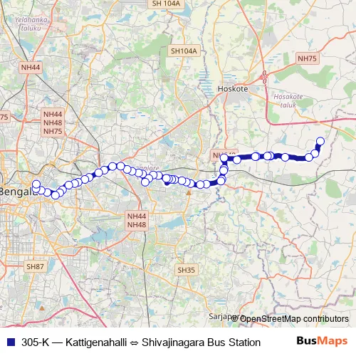 The first stop of the 305-K bus route is Kattigenahalli and the last stop is Shivajinagara Bus Station. 305-K (Kattigenahalli ⇔ Shivajinagara Bus Station) is operational during everyday.