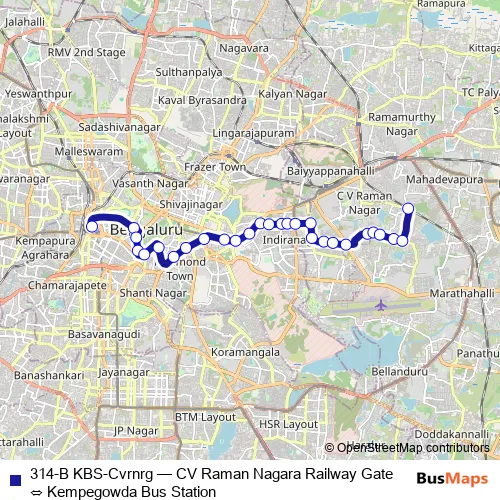 The first stop of the 314-B KBS-Cvrnrg bus route is Kempegowda Bus Station and the last stop is CV Raman Nagara Railway Gate. 314-B KBS-Cvrnrg (CV Raman Nagara Railway Gate ⇔ Kempegowda Bus Station) is operational during everyday.