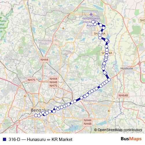 The first stop of the 316-D bus route is KR Market and the last stop is Hunasuru. 316-D (Hunasuru ⇔ KR Market) is operational during everyday.