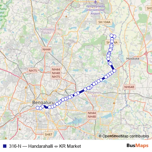 The first stop of the 316-N bus route is Handarahalli and the last stop is KR Market. 316-N (Handarahalli ⇔ KR Market) is operational during everyday.