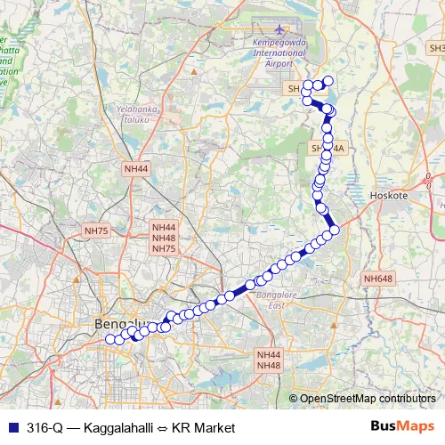 The first stop of the 316-Q bus route is KR Market and the last stop is Kaggalahalli. 316-Q (Kaggalahalli ⇔ KR Market) is operational during everyday.