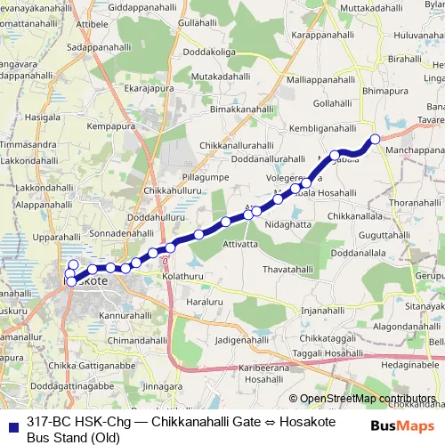 The first stop of the 317-BC HSK-Chg bus route is Hosakote Bus Stand (Old) and the last stop is Chikkanahalli Gate. 317-BC HSK-Chg (Chikkanahalli Gate ⇔ Hosakote Bus Stand (Old)) is operational during everyday.