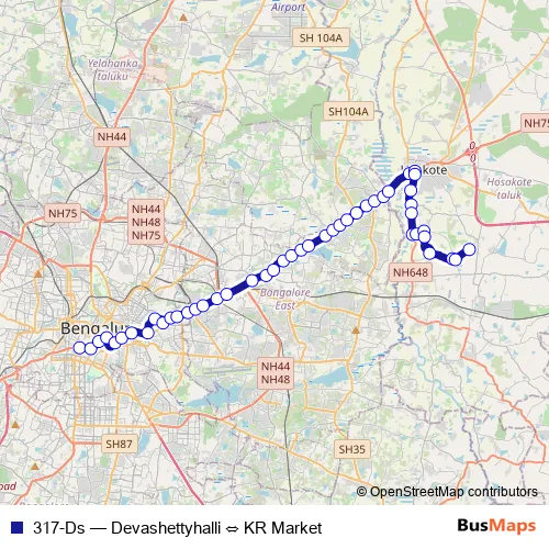 The first stop of the 317-Ds bus route is KR Market and the last stop is Devashettyhalli. 317-Ds (Devashettyhalli ⇔ KR Market) is operational during everyday.