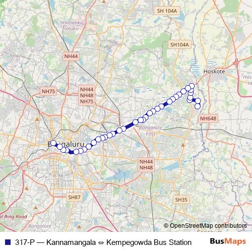 The first stop of the 317-P bus route is Kannamangala and the last stop is Kempegowda Bus Station. 317-P (Kannamangala ⇔ Kempegowda Bus Station) is operational during everyday.