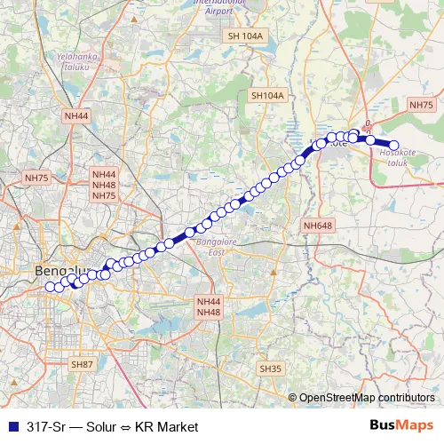 The first stop of the 317-Sr bus route is KR Market and the last stop is Solur. 317-Sr (Solur ⇔ KR Market) is operational during everyday.