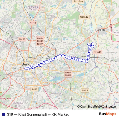 The first stop of the 319 bus route is KR Market and the last stop is Khaji Sonnenahalli. 319 (Khaji Sonnenahalli ⇔ KR Market) is operational during everyday.