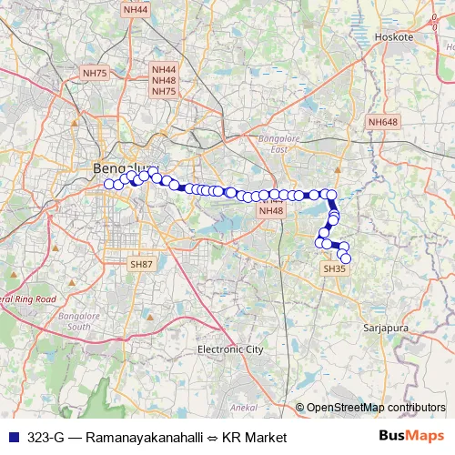 The first stop of the 323-G bus route is KR Market and the last stop is Ramanayakanahalli. 323-G (Ramanayakanahalli ⇔ KR Market) is operational during everyday.