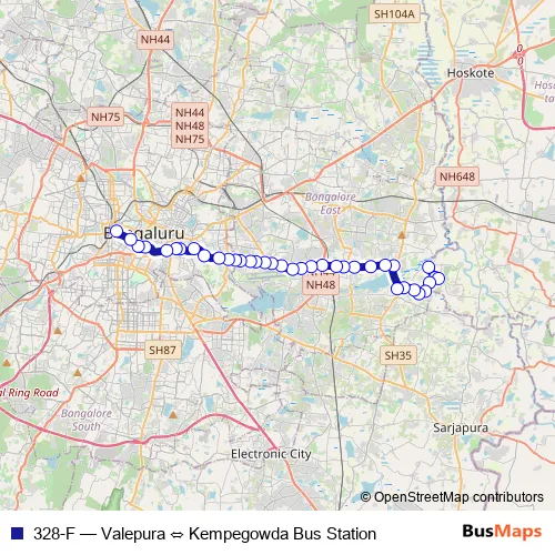 The first stop of the 328-F bus route is Valepura and the last stop is Kempegowda Bus Station. 328-F (Valepura ⇔ Kempegowda Bus Station) is operational during everyday.