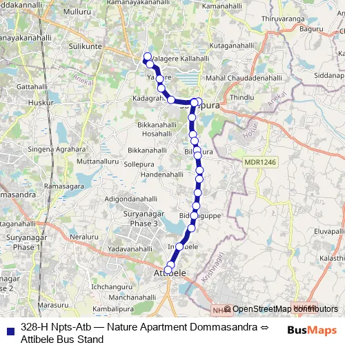The first stop of the 328-H Npts-Atb bus route is Nature Apartment Dommasandra and the last stop is Attibele Bus Stand. 328-H Npts-Atb (Nature Apartment Dommasandra ⇔ Attibele Bus Stand) is operational during everyday.