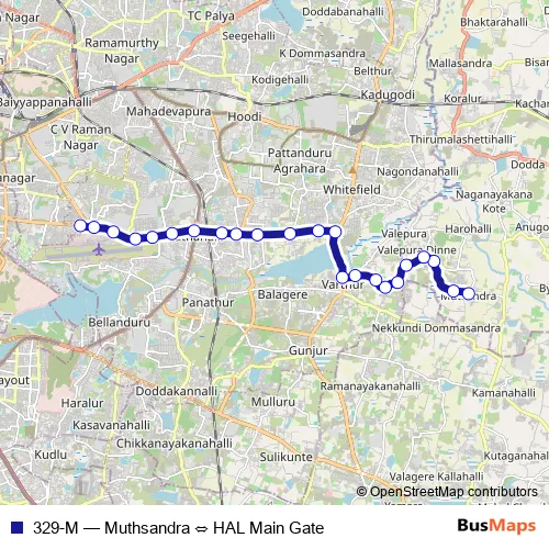 The first stop of the 329-M bus route is Muthsandra and the last stop is HAL Main Gate. 329-M (Muthsandra ⇔ HAL Main Gate) is operational during everyday.