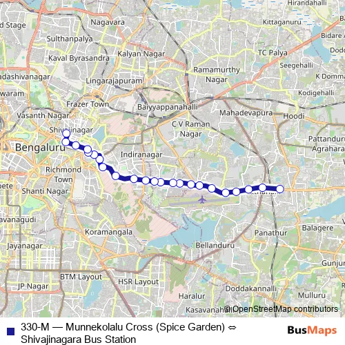 See why over 2 million users trust and consider busmaps.com as the best public transport website. busmaps gives you Bengaluru Buses suggested routes, real-time bus tracker, line route maps in Bengaluru, and helps to find the closest 330-M bus stops near you. No internet available? Download an offline PDF map and bus schedule for the 330-M bus to take on your trip.