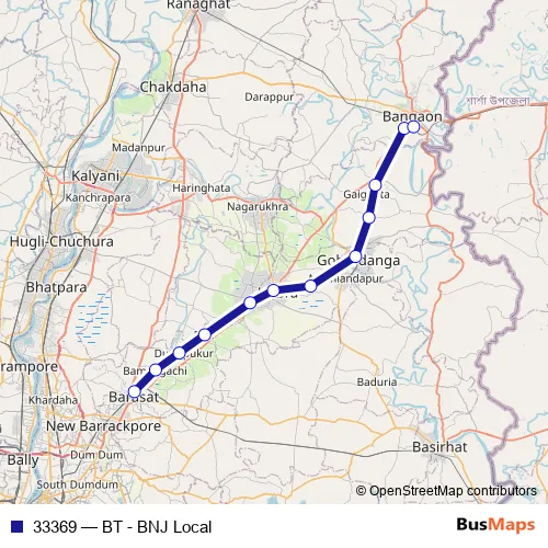 The first stop of the 33369 rail route is Barasat and the last stop is Bangaon Jn. 33369 (BT - BNJ Local) is operational during everyday.