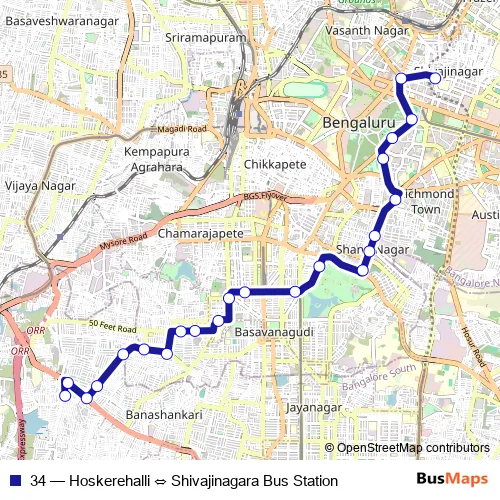 The first stop of the 34 bus route is Shivajinagara Bus Station and the last stop is Hoskerehalli. 34 (Hoskerehalli ⇔ Shivajinagara Bus Station) is operational during everyday.