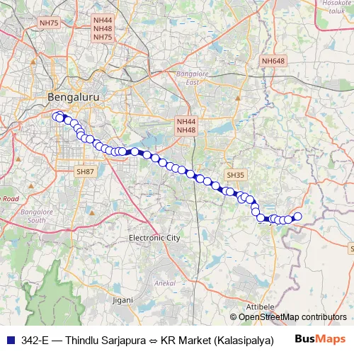 The first stop of the 342-E bus route is KR Market (Kalasipalya) and the last stop is Thindlu Sarjapura. 342-E (Thindlu Sarjapura ⇔ KR Market (Kalasipalya)) is operational during everyday.