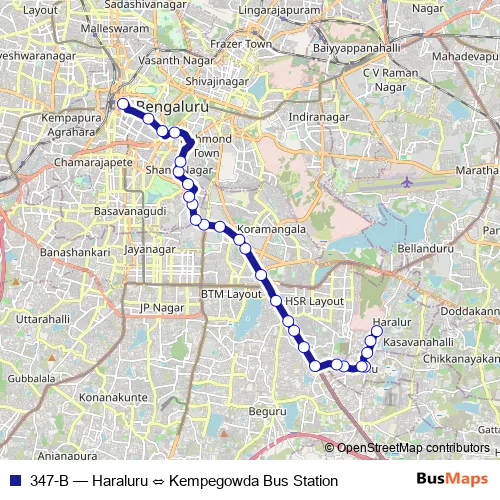 The first stop of the 347-B bus route is Haraluru and the last stop is Kempegowda Bus Station. 347-B (Haraluru ⇔ Kempegowda Bus Station) is operational during everyday.