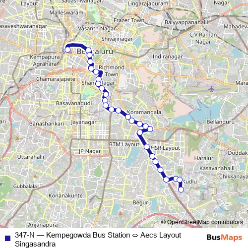 The first stop of the 347-N bus route is Kempegowda Bus Station and the last stop is Aecs Layout Singasandra. 347-N (Kempegowda Bus Station ⇔ Aecs Layout Singasandra) is operational during everyday.