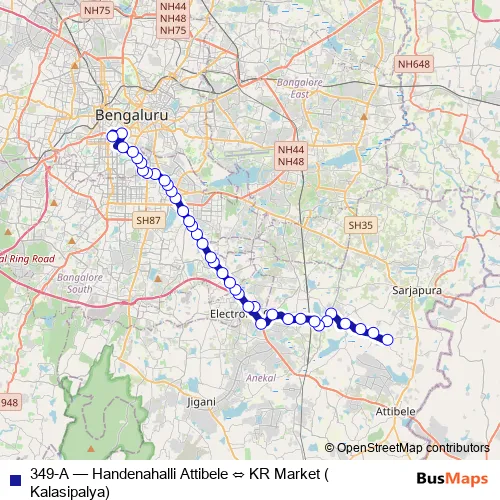 The first stop of the 349-A bus route is Handenahalli Attibele and the last stop is KR Market (Kalasipalya). 349-A (Handenahalli Attibele ⇔ KR Market (Kalasipalya)) is operational during everyday.