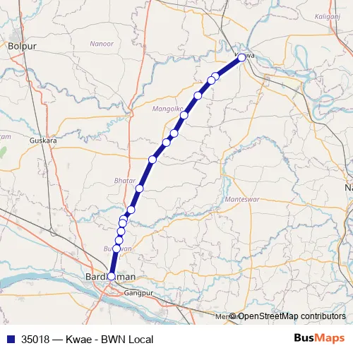 The first stop of the 35018 rail route is Katwa and the last stop is Bardhaman. 35018 (Kwae - BWN Local) is operational during everyday.