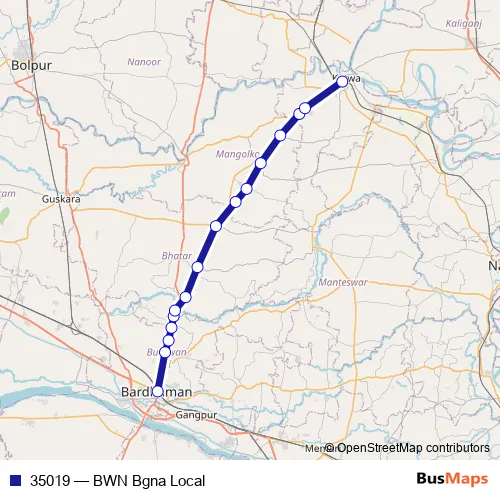 The first stop of the 35019 rail route is Bardhaman and the last stop is Katwa. 35019 (BWN Bgna Local) is operational during everyday.