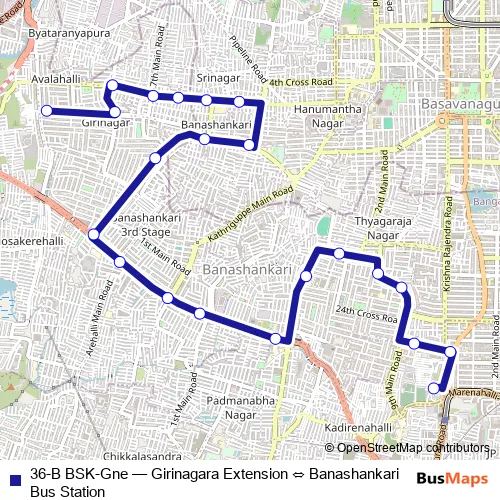 The first stop of the 36-B BSK-Gne bus route is Banashankari Bus Station and the last stop is Girinagara Extension. 36-B BSK-Gne (Girinagara Extension ⇔ Banashankari Bus Station) is operational during everyday.