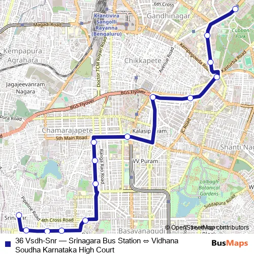 The first stop of the 36 Vsdh-Snr bus route is Vidhana Soudha Karnataka High Court and the last stop is Srinagara Bus Station. 36 Vsdh-Snr (Srinagara Bus Station ⇔ Vidhana Soudha Karnataka High Court) is operational during everyday.