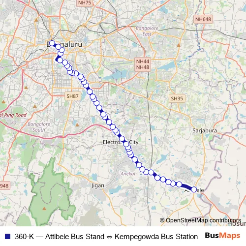 The first stop of the 360-K bus route is Attibele Bus Stand and the last stop is Kempegowda Bus Station. 360-K (Attibele Bus Stand ⇔ Kempegowda Bus Station) is operational during everyday.