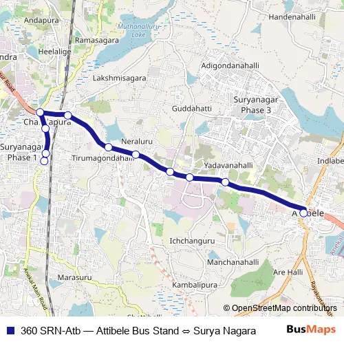 Click here to view the nearest 360 SRN-Atb - Attibele Bus Stand ⇔ Surya Nagara bus stop.