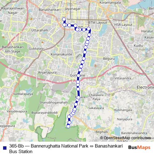 The first stop of the 365-Bb bus route is Bannerughatta National Park and the last stop is Banashankari Bus Station. 365-Bb (Bannerughatta National Park ⇔ Banashankari Bus Station) is operational during everyday.