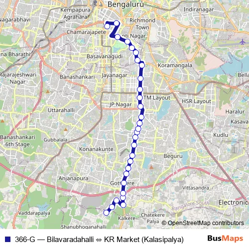 See why over 2 million users trust and consider busmaps.com as the best public transport website. busmaps gives you Bengaluru Buses suggested routes, real-time bus tracker, line route maps in Bengaluru, and helps to find the closest 366-G bus stops near you. No internet available? Download an offline PDF map and bus schedule for the 366-G bus to take on your trip.