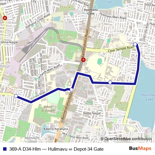 The first stop of the 369-A D34-Hlm bus route is Depot-34 Gate and the last stop is Hulimavu. 369-A D34-Hlm (Hulimavu ⇔ Depot-34 Gate) is operational during everyday.
