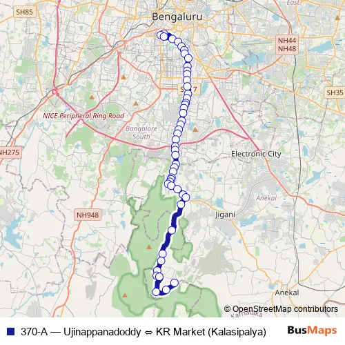 The first stop of the 370-A bus route is KR Market (Kalasipalya) and the last stop is Ujinappanadoddy. 370-A (Ujinappanadoddy ⇔ KR Market (Kalasipalya)) is operational during everyday.