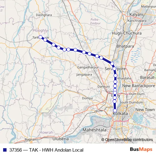The first stop of the 37356 rail route is Tarakeswar and the last stop is Howrah Jn. 37356 (TAK - HWH Andolan Local) is operational during everyday.