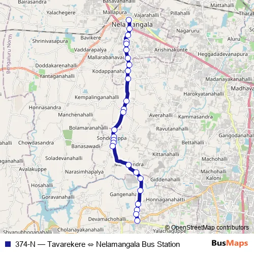 The first stop of the 374-N bus route is Nelamangala Bus Station and the last stop is Tavarekere. 374-N (Tavarekere ⇔ Nelamangala Bus Station) is operational during everyday.