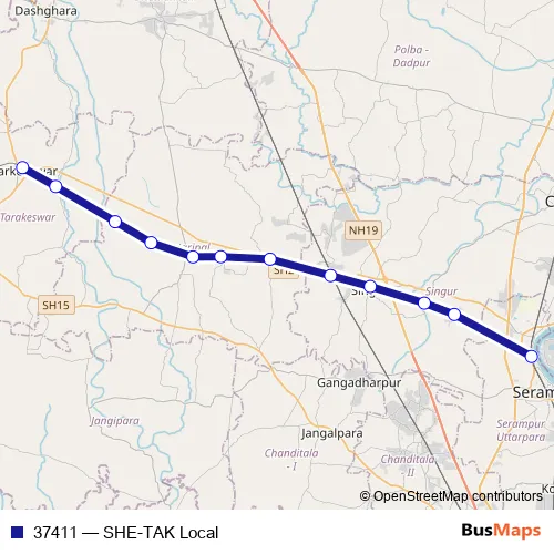 The first stop of the 37411 rail route is Seoraphuli and the last stop is Tarakeswar. 37411 (SHE-TAK Local) is operational during everyday.