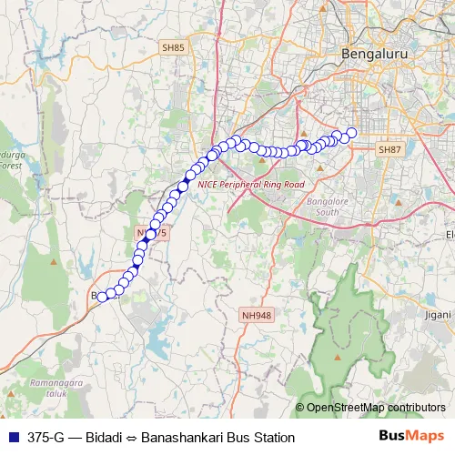 The first stop of the 375-G bus route is Banashankari Bus Station and the last stop is Bidadi. 375-G (Bidadi ⇔ Banashankari Bus Station) is operational during everyday.