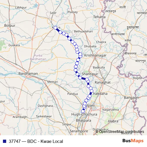 The first stop of the 37747 rail route is Bandel and the last stop is Katwa. 37747 (BDC - Kwae Local) is operational during everyday.