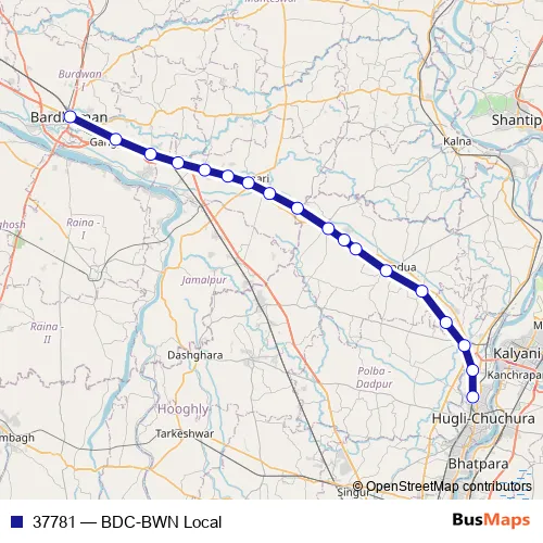 The first stop of the 37781 rail route is Bandel and the last stop is Bardhaman. 37781 (BDC-BWN Local) is operational during everyday.