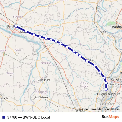 The first stop of the 37786 rail route is Bardhaman and the last stop is Bandel. 37786 (BWN-BDC Local) is operational during everyday.