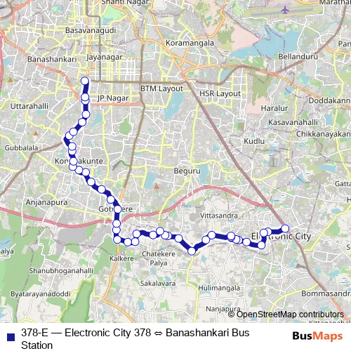 The first stop of the 378-E bus route is Electronic City 378 and the last stop is Banashankari Bus Station. 378-E (Electronic City 378 ⇔ Banashankari Bus Station) is operational during everyday.