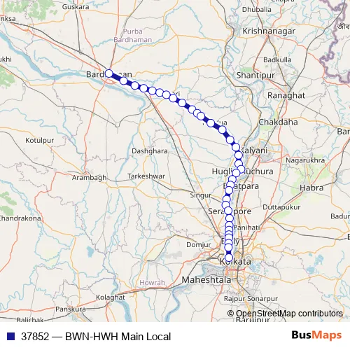 The first stop of the 37852 rail route is Bardhaman and the last stop is Howrah Jn. 37852 (BWN-HWH Main Local) is operational during everyday.