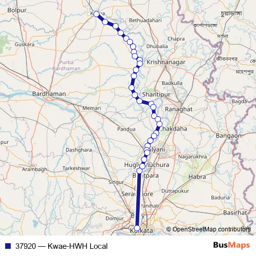 The first stop of the 37920 rail route is Katwa and the last stop is Howrah Jn. 37920 (Kwae-HWH Local) is operational during everyday.