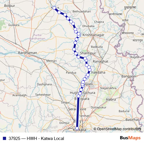 The first stop of the 37925 rail route is Howrah Jn and the last stop is Katwa. 37925 (HWH - Katwa Local) is operational during everyday.