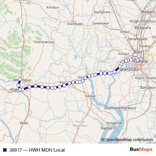 The first stop of the 38817 rail route is Howrah Jn and the last stop is Midnapore. 38817 (HWH MDN Local) is operational during everyday.