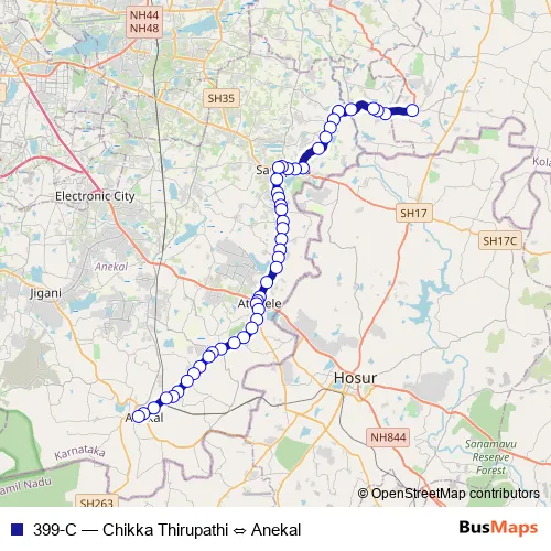Services on the 399-C - Chikka Thirupathi ⇔ Anekal bus stop at 21:14 on Monday, Tuesday, Wednesday, Thursday, Friday, Saturday, Sunday.