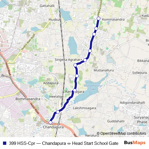 The first stop of the 399 HSS-Cpr bus route is Head Start School Gate and the last stop is Chandapura. 399 HSS-Cpr (Chandapura ⇔ Head Start School Gate) is operational during everyday.