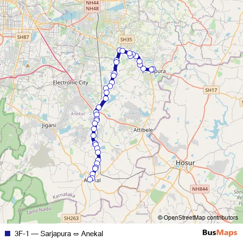 The first stop of the 3F-1 bus route is Sarjapura and the last stop is Anekal. 3F-1 (Sarjapura ⇔ Anekal) is operational during everyday.