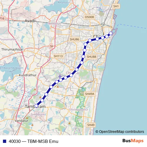The first stop of the 40030 rail route is Tambaram and the last stop is Chennai Beach. 40030 (TBM-MSB Emu) is operational during everyday.
